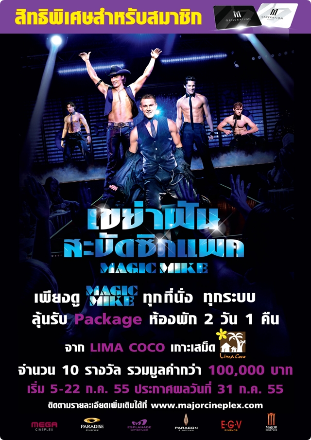 สิทธิพิเศษเฉพาะสมาชิก M Gen ตั๋วชมภาพยนตร์ Magic Mike ทุกทีนั่ง (ในทุกระบบ) ลุ้นรับ Package ห้องพัก 2 วัน 1 คืน จาก Lima Coco จำนวน 10 รางวัล รวมมูลค่ากว่า 100,000 บาท