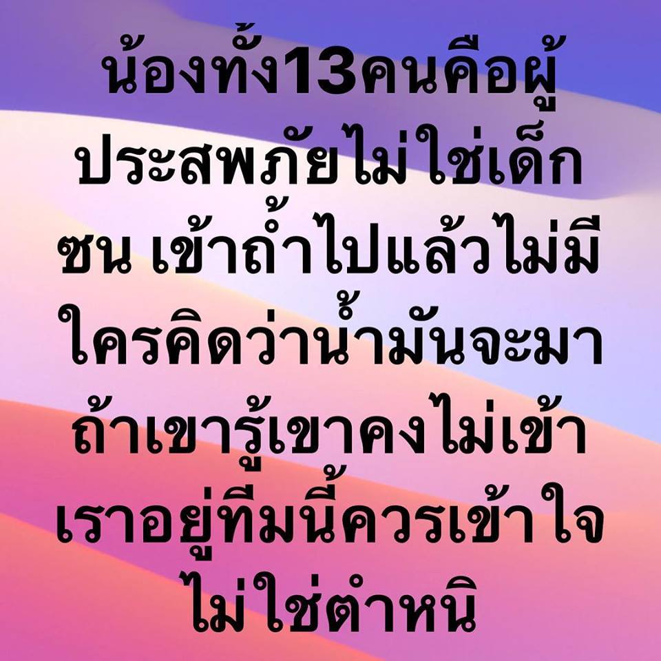 นอกจากนี้ยังได้แสดงความคิดเห็นว่า จากกรณีถ้ำหลวงน้องทั้ง13คนคือผู้ประสบภัย ไม่ใช่เด็กซน เข้าไปถ้ำแล้วไม่มีใครคิดว่าน้ำมันจะมาถ้าเขารู้เขาคงไม่เข้า..เราอยู่ทีมนี้ควรเข้าใจไม่ใช่ตำหนิ ข้อดีถ้าน้องๆไม่ติดอยูในถ้ำเราก็จะไม่ได้เห็นภาพคนไทยรักกันสามัคคีกันขนาดนี้