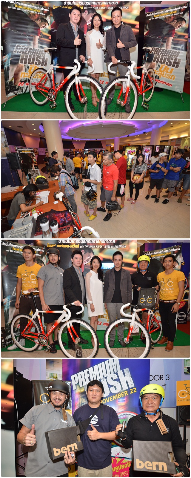 “โซนี่ พิคเจอร์ส จับมือ LA Bicycle และ เมเจอร์ ซีนีเพล็กซ์” วีรวิชญ์ อริยเกริกเกียรติ ผู้ช่วยผู้จัดการ บริษัท โซนี่ พิคเจอร์ส รีลิสซิ่ง อินเตอร์เนชั่นแนล (ซ้ายสุด) ร่วมกับ สาโรจน์ อนันต์สิทธิโชค ผู้จัดการฝ่ายการตลาด บริษัท เมเจอร์ ซีนีเพล็กซ์ กรุ๊ป จำกัด (มหาชน) (ขวาสุด) และ จุฑาทิพย์ ติยะวัชรพงศ์ ผู้อำนวยการผลิตภัณฑ์จักรยานไฟฟ้าแอลเออีไรด์ และผู้จัดการฝ่ายประชาสัมพันธ์ บริษัท คัลเจอร์ไซคลิสท์ จำกัด (คนกลาง) จัดกิจกรรมเอาใจนักปั่น Fix Gear จำนวน 300 ท่าน ในวันที่ 17 พฤศจิกายน 2555 ได้ปั่นขบวน Fix Gear จากถนนพระราม 4 เพื่อมามันส์กับภาพยนตร์เรื่อง Premium Rush ในโรงภาพยนตร์ รอบพรีวิวก่อนใคร ทั้งนี้ได้จัดแคมเปญพิเศษ ให้แก่ผู้เข้าชมภาพยนตร์เรื่อง “Premium Rush....ปั่นทะลุนรก” ทุก 2 ที่นั่ง ลุ้นรับจักรยานฟิกซ์เกียร์ LA Bicycle Track Pro จำนวน 12 รางวัลฟรี (ตั้งแต่วันที่ 22 พฤศจิกายน 2555 เป็นต้นไป จนหมดโปรแกรมฉายภาพยนตร์) ณ โรงภาพยนตร์เมเจอร์ซีนีเพล็กซ์ สุขุมวิท เมื่อวันเสาร์ที่ 17 พฤศจิกายน 2555 ที่ผ่านมา