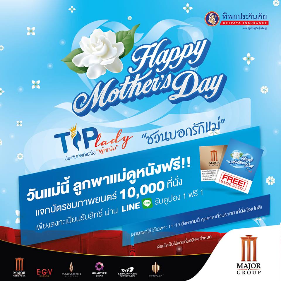 1. TIP Lady ชวนบอกรักแม่ วันแม่นี้ ลูกพาแม่ดูหนังฟรี!! แจกบัตรชมภาพยนตร์ 10,000 ที่นั่ง เพียงลงทะเบียนรับสิทธิ์ ผ่าน LINE @majorgroup หรือคลิก http://bit.ly/Line-Majorgroup และพิมพ์คำว่า “Major Mother Day” เพื่อลงทะเบียนรับสิทธิ์ซื้อบัตรชมภาพยนตร์ 1 ฟรี 1 ตั้งแต่วันที่ 4-9 ส.ค. 61 นี้เท่านั้น