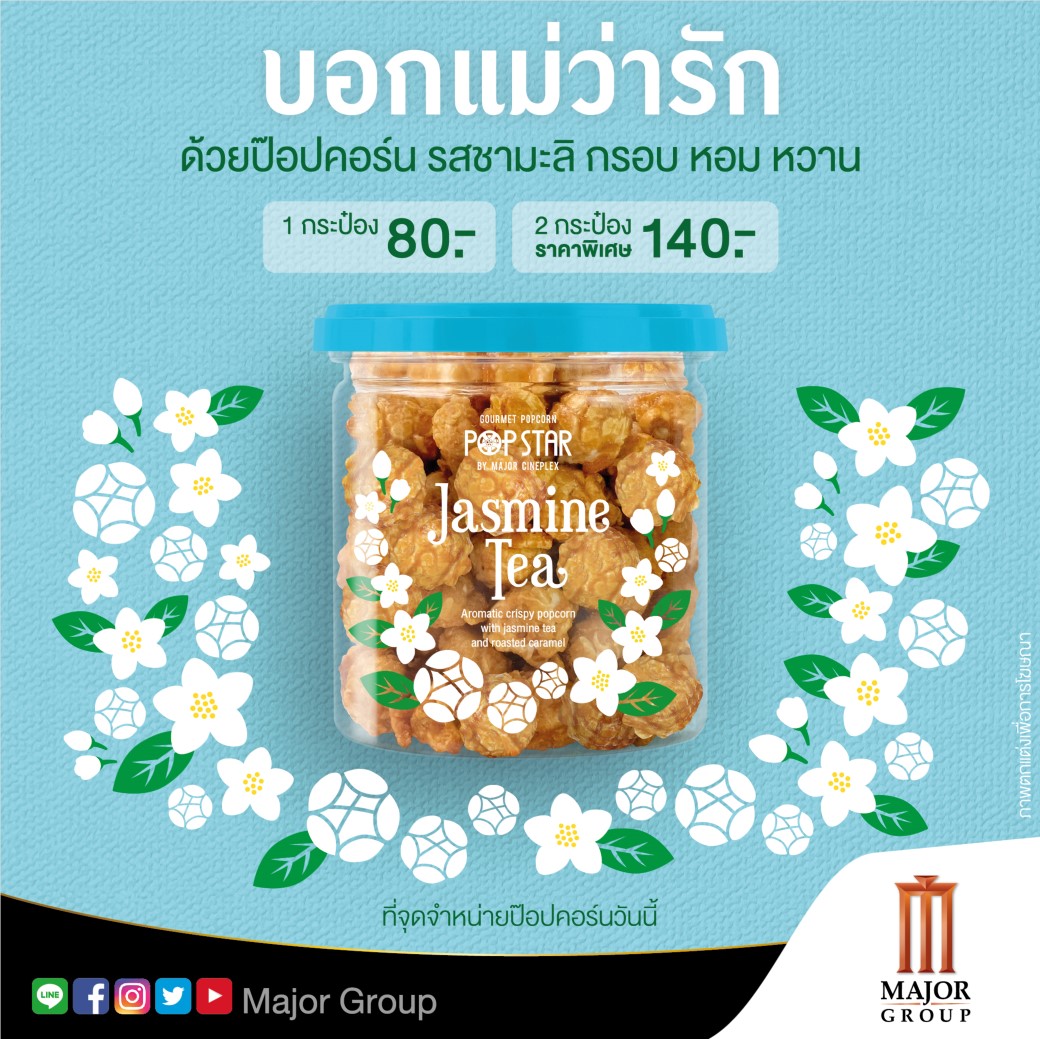 คัดเลือกป๊อปคอร์นและวัตถุดิบคุณภาพดี ปรุงรสด้วยใจ บรรจุใส่กล่องลายดอกมะลิ มอบให้แม่เป็นของขวัญแทนทุกคำพูด บอกรักแม่ด้วยป๊อปคอร์นรสชามะลิ