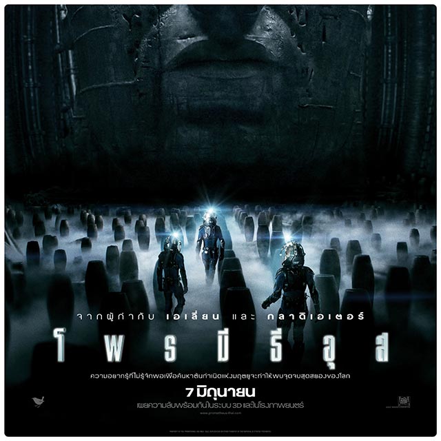 สำหรับอาร์เธอร์ แม็กซ์ ผู้ออกแบบฉากในภาพยนตร์เรื่อง PROMETHEUS โลกที่เห็นในภาพยนตร์ไม่ได้หมายถึงการสร้างทิวทัศน์นอกโลกบนดวงดาวที่ลูกเรือไปเยี่ยมเท่านั้น แต่ยังหมายถึงยานอวกาศโพรมีธีอุสที่มีเทคโนโลยีล้ำสมัยขั้นสูง ซึ่งเป็นความภูมิใจของกองบินของ Weyland Corporation ในอนาคตอีก 70 ปีข้างหน้า และเป็นสิ่งที่ลูกเรือผู้เป็นมนุษย์ในภาพยนตร์เรียกว่าเป็นที่พักอาศัย ไมเคิล ฟาสเบนเดอร์ไม่อยากเชื่อในผลงานที่ปรากฏอยู่ในฉากของยานอวกาศที่สร้างขึ้นมาเลย “ผมไม่คิดว่าจะได้เห็นอะไรที่น่าประทับใจขนาดนี้” เขากล่าวอย่างกระตือรือร้น “ผมจำได้ว่าเดินอยู่บนเรือในช่วงวันแรกๆ แล้วรู้สึกเหมือนอยู่บนยานจริงๆ ไม่จำเป็นต้องแสดงเลย ผมกดปุ่มพวกนี้ทุกปุ่มและมันก็ทำงานได้หมด แผงบังคับแทบจะเป็นหัวใจของยานที่แสดงให้เห็นสัญญาณที่สำคัญของยาน ทุกอย่างถูกคิดมาอย่างเสร็จสรรพ” ไอดริส เอลบ้า ผู้รับบทแสดงเป็นกัปตันเจเน็ค ผู้มีหน้าที่บังคับยานอวกาศกล่าวเห็นด้วยว่า “ผมไม่ได้บังคับยานอวกาศนั้นเพื่อเอาชีวิตตัวเองรอด แต่เพราะการแต่งตั้งให้ผมนั่งอยู่หน้าแผงควบคุมที่มีการใช้งานได้จริง เรากดปุ่มนี้ก็มีบางอย่างเกิดขึ้น กดปุ่มนั้นก็มีอย่างอื่นเกิดขึ้น... สำหรับริดลีย์ เขาเป็นคนที่เข้าใจทุกอย่างเกี่ยวกับยานอวกาศ เขาออกแบบมันมาจากความคิดของเขาและออกแบบให้มันใช้งานได้ นั่นคือสิ่งที่ทำให้เขามีความพิเศษมาก” “มีการใช้วิชวลเอ็ฟเฟ็กต์หลายอย่างในเรื่อง แต่เราก็พยายามใช้ของจริงให้มากที่สุดเสมอ” ไมเคิล เอลเลนเบิร์ก ผู้อำนวยการสร้างบริหารกล่าว “เพราะฉะนั้นวิชวลเอ็ฟเฟ็กต์จะบ่งบอกและแปลงสภาพเข้ากับสิ่งที่มีอยู่แล้ว แทนที่จะเสริมสร้างมันขึ้นมาใหม่ นั่นคือความแตกต่างระหว่างการมอบประสบการณ์ในอนาคตให้รู้สึกได้ถึงความน่าเชื่อถือ ความสมจริงและไม่สมจริง อันที่จริงสิ่งที่สร้างขึ้นด้วยวิชวลเอ็ฟเฟ็กต์อาจง่ายกว่านิดหน่อย แต่จริงๆ แล้วมันไม่ได้ต้นทุนต่ำเสมอไป และหากเราสร้างบางสิ่งขึ้นมาได้และทำให้รู้สึกได้ว่ามันดูสมจริงได้ทุกอย่างก็จะดีกว่า โดยเฉพาะเวลาที่เราพยายามทำให้พวกเขารู้สึกกลัว” นักแสดงชายโลแกน มาร์แชล-กรีนพูดถึงการออกแบบยาน โครงสร้างที่หล่อเลี้ยงเข้าไปสู่การกระตือรือร้นแห่งตัวละครที่แบ่งแยกลูกเรือของยานโพรมีธีอุสไว้ว่า “ทุกคนในที่นั้นต่างจับตาดูคนอื่น” เขากล่าว “มันเป็นเรื่องที่งดงามนะ เหมือนที่คุณพูดว่าทุกคนอยู่ที่นั่นเพื่อจับตาดูคนอื่น แต่มันก็เป็นการจับคู่ได้อย่างงดงามเมื่อเรามีตัวละครของนูมีและ