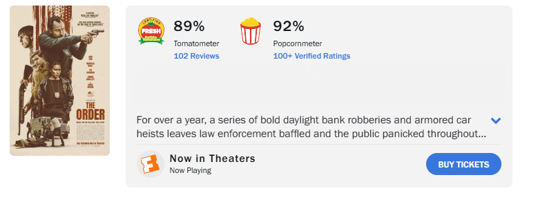 เป็นม้ามืดที่น่าจับตามองมากที่สุดปลายปีนี้สำหรับ “The Order จับตายขบวนการเดนคน” ภาพยนตร์อาชญากรรมสุดระทึกที่สร้างจากเรื่องจริงเมื่อช่วงปี 1980 ของขบวนการที่เรียกตัวเองว่า “ดิ ออร์เดอร์” (The Order) ลัทธิเหยียดผิวหัวรุนแรงที่มีความคิดสุดโต่งว่าคนขาวเหนือกว่าผู้อื่น พวกมันทั้งปล้น ฆ่า ปลอมแปลงธนบัตร ก่อเหตุความวุ่นวายทั่วเขตอเมริกาเหนือยาวนานนับปี ด้วยเนื้อเรื่องที่แม้จะเล่าเรื่องราวในอดีตแต่สามารถสะท้อนปัญหาของปัจจุบันได้อย่างเข้มข้น และฉากแอ็กชันที่จำลองสถานการณ์จริงได้อย่างเดือดดาล ส่งให้ภาพยนตร์ได้รับคำชมจากสื่อหลักทุกสำนักอย่างเป็นเอกฉันท์ และกวาดคะแนนจากนักวิจารณ์ทางเว็บไซต์ Rotten Tomatoes สูงถึง 89% และฝั่งผู้ชมถึง 92%
