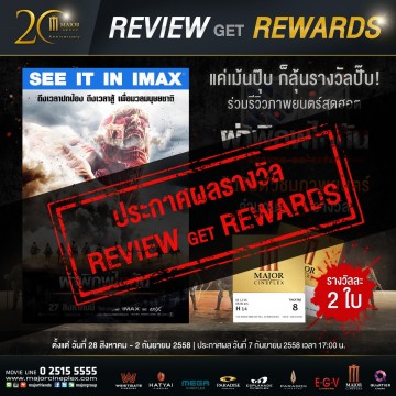 ใครดูแล้วอย่าลืมมารีวิวเขียนบอกเล่าความรู้สึกที่มีต่อหนังเรื่องนี้ในในสไตล์ของคุณ พร้อม ติดแฮชแท็ก #ReviewGETRewards และ #Majorfriends เพื่อลุ้นรับของรางวัลสุดเจ๋งจาก www.majorcineplex.com โดยรีวิวที่โดนใจทีมงานมากที่สุด ลุ้นรับบัตรชมภาพยนตร์ แจก 10 รางวัล รางวัลละ 2 ใบ