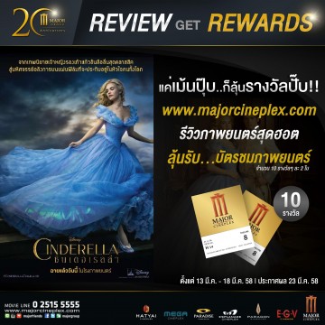 Cinderella จากเทพนิยายสุดคลาสสิค สู่ภาพยนตร์ฟอร์มยักษ์ จากผลงานของดิสนีย์ ที่ร่ายมนต์ตราตรึงสุดประทับใจ ใครดูแล้วอย่าลืมมารีวิวบอกต่อสิ่งที่ชอบมากที่สุดในหนังในสไตล์ของคุณ พร้อม ติดแฮชแท็ก #ReviewGETRewards เพื่อลุ้นรับของรางวัลสุดเจ๋งจาก www.majorcineplex.com โดยรีวิวที่โดนใจทีมงานมากที่สุด ลุ้นรับบัตรชมภาพยนตร์ แจก 10 รางวัล รางวัลละ 2 ใบ http://www.majorcineplex.com/movie/cinderella
