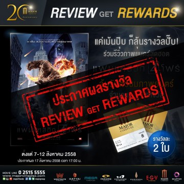 ใครดูแล้วอย่าลืมมารีวิวเขียนบอกเล่าความรู้สึกที่มีภาพยนตร์เรื่องนี้ในหนังในสไตล์ของคุณ พร้อม ติดแฮชแท็ก #ReviewGETRewards และ #Majorfriends เพื่อลุ้นรับของรางวัลสุดเจ๋งจาก www.majorcineplex.com โดยรีวิวที่โดนใจทีมงานมากที่สุด ลุ้นรับบัตรชมภาพยนตร์ แจก 10 รางวัล รางวัลละ 2 ใบ