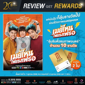 เมย์ไหนไฟแรงเฟร่อ  การกลับมาของภาพยนตร์อารมณ์ดีของค่าย GTH นำทีมความโรแมนติกคอมเมดี้ โดย ปันปัน สุทัตตา,แบงค์ ธิติ,ต่อ ธนภพ เสริมทัพด้วยนักเรียนวัยเกรียนที่จะมาสร้างความประทับใจให้กับทุกคน อีกหนึ่งหนังคุณภาพของ GTH  ใคร ดูแล้ว อย่าลืมมารีวิวเล่าความรู้สึกหลังชมหนังในสไตล์ของคุณ พร้อมติดแฮชแท็ก #ReviewGETRewards และ #Majorfriends เพื่อลุ้นรับของรางวัล จาก www.majorcineplex.com โดยรีวิวที่โดนใจทีมงานมากที่สุด ลุ้น รับบัตรชมภาพยนตร์ 10 รางวัล (รางวัลละ2 ที่นั่ง)