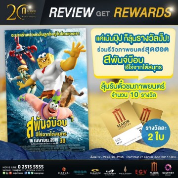 แฟนคลับรุ่นเล็กเตรียมพบกับความสนุกหรรษาในรูปแบบ 3D จาก พาราเมาท์ พิคเจอร์ส และนิคคาโลเดียน มูฟวี่ส์ กับ สพันจ์บ็อบ ฮีโร่จากใต้สมุทร 3D ที่เหล่าสิ่งมีชีวิตไร้กระดูกสันหลังจะยกทีมขึ้นบก มาผจญภัยกันบนภาคพื้นดิน ใครดูแล้วอย่าลืมมารีวิวเขียนบอกเล่าความรู้สึกที่มีต่ออนิเมชั่นเรื่องนี้ในหนังในสไตล์ของคุณ พร้อม ติดแฮชแท็ก #ReviewGETRewards และ #Majorfriends เพื่อลุ้นรับของรางวัลสุดเจ๋งจาก www.majorcineplex.com โดยรีวิวที่โดนใจทีมงานมากที่สุด ลุ้นรับบัตรชมภาพยนตร์ แจก 10 รางวัล รางวัลละ 2 ใบ