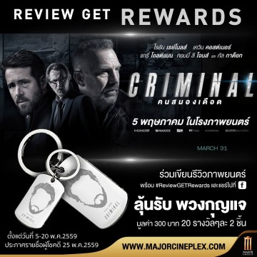 ใครไปดูมาแล้วเข้ามารีวิวภาพยนตร์ที่   พร้อมติด แฮชแท็ก #ReviewGETRewards และ #Majorfriends เพื่อลุ้นรับของรางวัล โดยรีวิวที่โดนใจทีมงานมากที่สุด  ลุ้นรับพวงกุญแจที่ระลึกจากภาพยนตร์   Criminal คนสมองเดือด 20 รางวัล รางวัลละ 2 ชิ้น