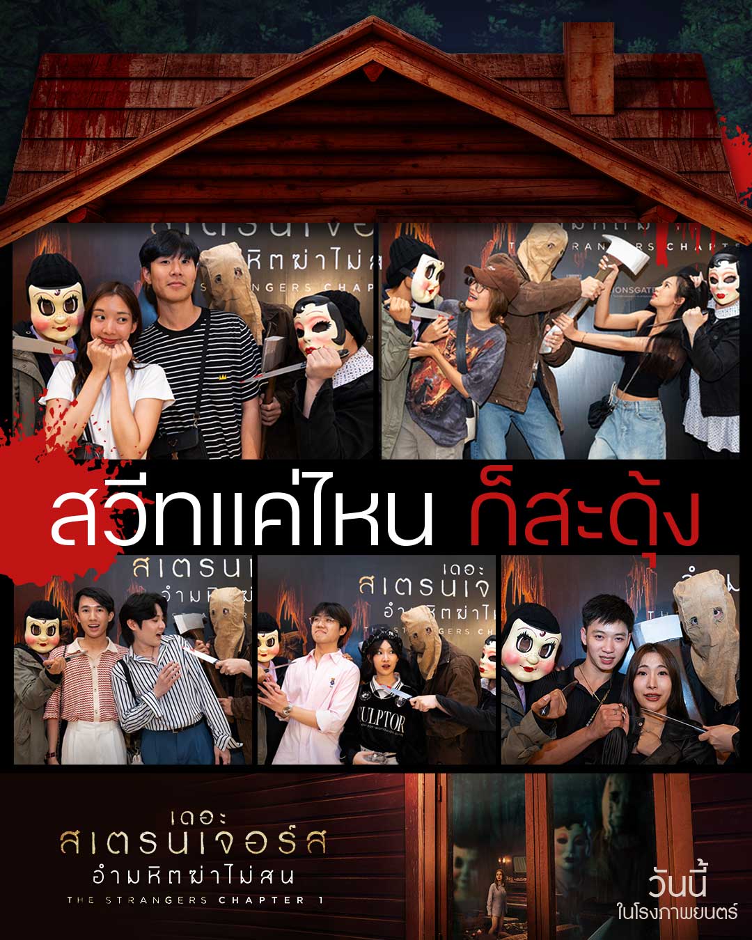 ประตูความสยอง “อำมหิตฆ่าไม่สน” เปิดขึ้นแล้ว กับบทแรกของหนังไตรภาค “The Strangers: Chapter 1” ภาพยนตร์ไล่ฆ่าที่ทั้งโลกรอคอย เรียกเสียงกรีดร้องจากคอหนังสยองขวัญแห่งยุค อาทิ “แชมป์ JUST ดู IT”, “กัน Hollywood GossipGun”, “ต๊อกแต๊ก Pizza Movie” และ “เพจ The House” ดังลั่นสนั่นโรง นอกจากนี้เหล่าคู่รักยอดวิวหลักล้านแห่งวงการ TikTok อย่าง “willcomeback.w”, “katykindacute”, “auauee”, “jentlysara”, “mypawe.my” ที่มาหวานกันผิดที่แบบสุดๆ ต่างก็พูดเป็นเสียงเดียวกันว่า “สยองจนสวีทไม่ลง!”
