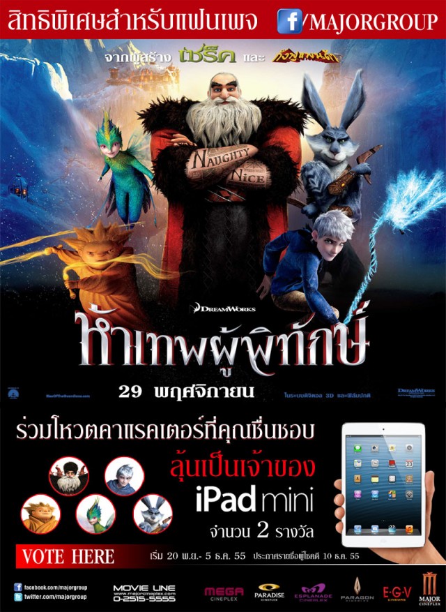 ร่วมโหวตคาแรคเตอร์ที่คุณชื่นชอบใน "Rise of the Guardians ห้าเทพผู้พิทักษ์" ลุ้นเป็นเจ้าของ iPad mini จำนวน 2 รางวัล เริ่ม 20 พ.ย. - 5 ธ.ค. 55 ประกาศรายชื่อผู้โชคดี 10 ธ.ค. 55