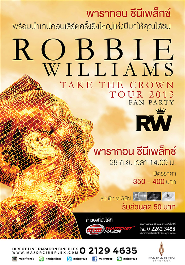 พารากอน ซีนีเพล็กซ์ พร้อมนำเทปบันทึกคอนเสิร์ตครั้งยิ่งใหญ่แห่งปีมาให้คุณได้ชม ROBBIE WILLIAMS TAKE THE CROWN TOUR 2013 FAN PARTY