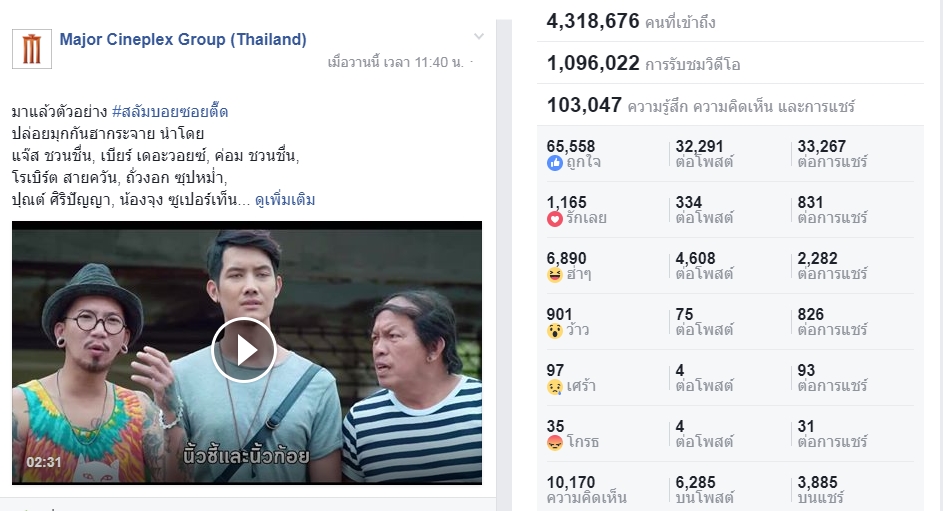 สลัมบอย ซอยตื๊ด ผลงานหนังล่าสุดจาก M39 ที่ปล่อยตัวอย่างฉบับเต็มออกมา สร้างสีสันให้กับโลกโซเชียล ภายใน 24 ชั่วโมง มีคนดูบนแฟนเพจ Major Cineplex Group (Thailand) มากกว่า 1,096,022 วิว รวมถึงมียอดการกดแสดงความรู้สึก ความคิดเห็น และการแชร์ จำนวน 103,047 ครั้ง