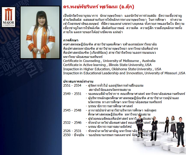 การพัฒนาความคิดและศักยภาพของคนเป็นสิ่งสำคัญ ซึ่งจะส่งผลให้ธุรกิจประสบความสำเร็จต่อไปในอนาคต การสัมมนาเชิงธุรกิจจึงถือเป็นเรื่องจำเป็นและมีการพัฒนามาโดยตลอด แต่ทำไมการสัมมนาต้องทำในสถานที่ภายในบริษัทหรือที่โรงแรมเท่านั้น ทางบริษัท เมเจอร์ ซีนีเพล็กซ์ กรุ้ป จำกัด (มหาชน) จึงอยากนำเสนอโครงการสัมมนา และใคร่ขอเรียนเชิญท่านเข้าร่วมงาน Seminar Showcase เปิดมุมมองสู่มิติใหม่ของการสัมมนาอันน่าตื่นเต้นในโรงภาพยนตร์ พร้อมด้วยระบบแสงสีเสียงและภาพแสดงบนจอภาพยนตร์ พบกับวิทยากรชั้นนำที่ทางบริษัทฯ สรรหามานำเสนอ ดังนี้รายชื่อวิทยากรผู้ทรงคุณวุฒิ