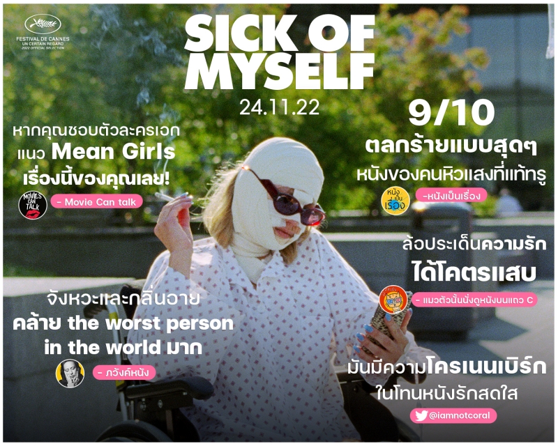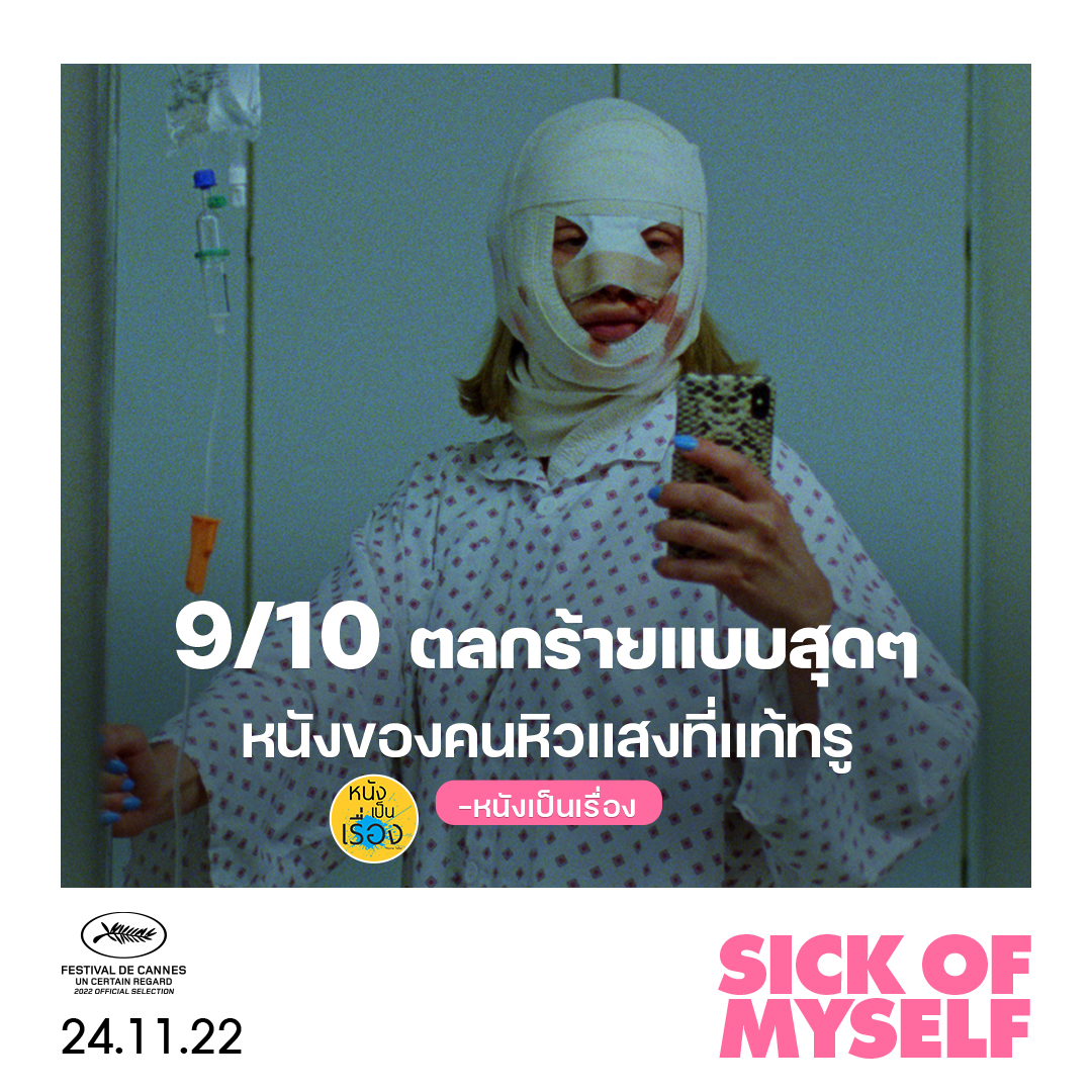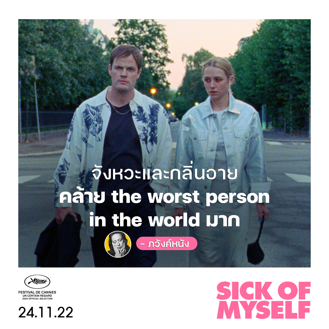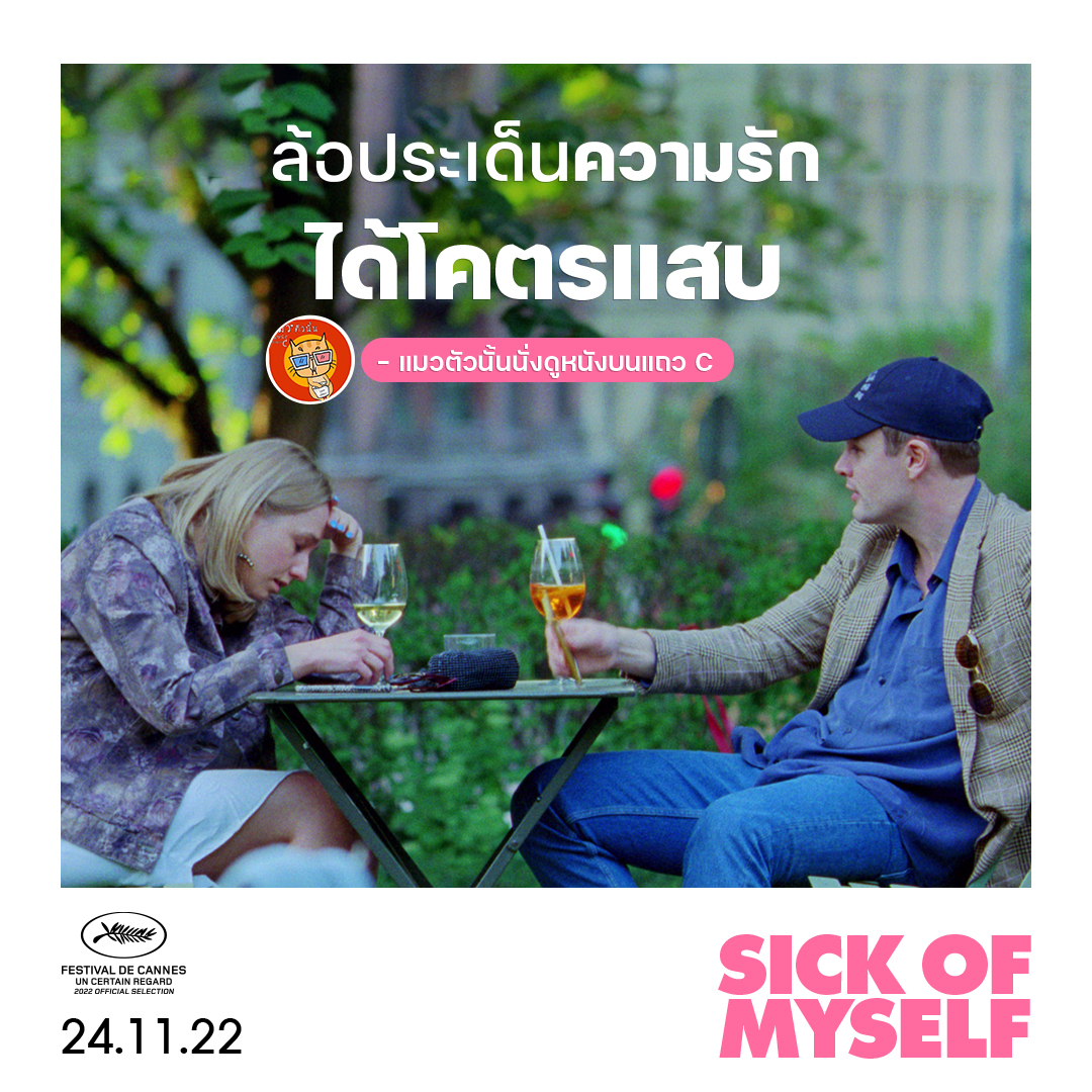 ถือเป็นภาพยนตร์รักโคตรแสบแห่งปีสำหรับภาพยนตร์ SICK OF MYSELF งานล่าสุดของผู้สร้าง The worst person in the world  เรื่องราวของ ซิกเนอและโทมัส คู่รักที่กำลังตกอยู่ในความสัมพันธ์แบบทั้งรักทั้งเกลียด ที่ต่างคนต่างอยากเอาชนะกัน ความสัมพันธ์เริ่มเลวร้ายขึ้นเมื่อจู่ ๆ โทมัสก็กลายเป็นศิลปินร่วมสมัยผู้มีชื่อเสียง ซิกเนอจึงพยายามกอบกู้สถานการณ์อย่าง สิ้นหวังด้วยการสร้างตัวตนใหม่ที่พร้อมจะดึงดูดความสนใจและความเห็นใจจากทุกคน