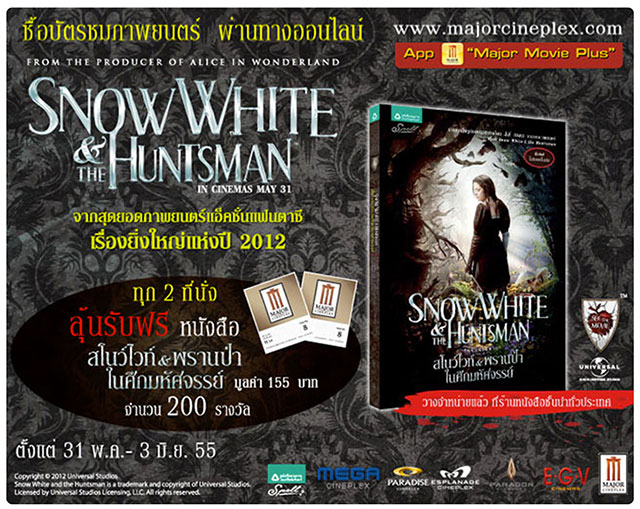 ประกาศรายชื่อผู้โชคดี รับฟรี หนังสือ Snow White and the Huntsman เมื่อซื้อตั๋วออนไลน์ ทุก 2 ที่นั่ง ผ่านทาง Application “Major Movie Plus” และ www.majorcineplex.com มูลค่า 155 บาท (จำนวน 200 รางวัล)