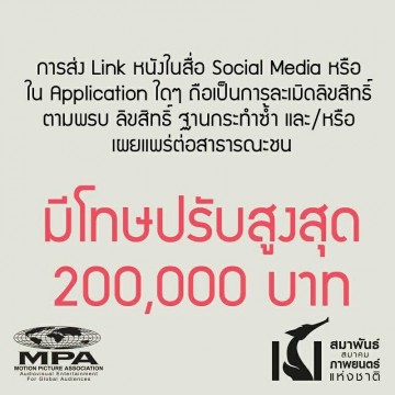 สมาพันธ์สมาคมภาพยนตร์แห่งชาติ ได้โพสต์ภาพและข้อความระบุว่า ขณะนี้ทางสมาพันธ์สมาคมภาพยนตร์แห่งชาติ ร่วมกับค่ายหนังทุกค่าย และ สำนักงานตำรวจแห่งชาติ จะดำเนินการตรวจสอบปราบปรามเว็บดูหนังเถื่อน ตั้งแต่บัดนี้เป็นต้นไป ขอความกรุณาหยุดการแนะนำหรือส่ง Link เว็บดูหนังเถื่อนเพราะผู้ส่ง จะมีความผิดไปด้วย โดยการส่งลิงค์ ภาพยนตร์ในสื่อโซเชียลมีเดียหรือแอปพลิเคชั่นใดๆเป็นการละเมิดลิขสิทธิ์ ตาม พ.ร.บ.ลิขสิทธิ์ ฐานกระทำซ้ำและเผยแพร่ต่อสาธารณะชน มีโทษปรับสูงสุดสองแสนบาท