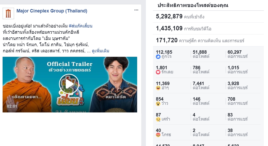 ภาพยนตร์ไทยอีสานเรื่อง ส่มภัคเสี่ยน ได้ปล่อยตัวอย่างออกมาให้ชาวออนไลน์ได้ดูกัน นำทีมความฮาโดย หม่ำ จ๊กมก และ โตโน่ ภาคิน พร้อมนักแสดงสมทบอีกคับคั่ง โดยหลังจากปล่อยผ่านแฟนเพจ Major Cineplex Group (Thailand) ภายในระยะเวลาไม่ถึง 24 ชั่วโมง มียอดวิว 1,435,109 การรับชมวิดีโอ และมี 5,292,879คนที่เข้าถึง