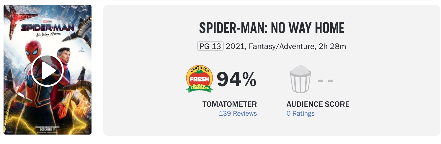 rottentomatoes.com/ เว็บไซต์รวมคะแนนจากรีวิวนักวิจารณ์ชั้นนำ ประกาศคะแนนเทบวก 94% พร้อมเครื่องหมายการันตีความสด จากทั้งหมด 139 รีวิว โดยส่วนใหญ่ชื่นชมการเล่าเรื่องที่ครบรส เต็มเปี่ยมไปด้วยพลัง สะเทือนอารมณ์ และงานแอ็กชั่นที่ตื่นตาตื่นใจ นำไปสู่การขยายจักรวาลไอ้แมงมุมได้แบบยิ่งใหญ่ รวมถึงเซอร์ไพรส์ที่ใส่มาแบบไม่ยั้ง ทำให้แฟนๆที่เอาใจช่วยเจ้าเด็กเกรียนจาก Civil War ผ่าน Homecoming, Far From Home มาจนถึง No way Home ตัวละครผ่านการเติบโต เรียนรู้ และวิบากกรรมอะไรมาบ้าง หล่อหลอมให้เขาเป็ซูเปอร์ฮีโร่ที่เต็มไปด้วยภาระอันยิ่งใหญ่