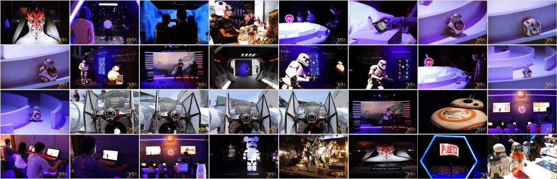 จัดแสดงออกเป็น 8 โซนให้ตะลุยความมันส์กัน เช่น โซน Choose Destiny ให้มาดวลดาบไลท์เซเบอร์จากพลังด้านมืดและสว่าง,ถ่ายรูปกับสตรอมทรูปเปอร์และหุ่น BB-8 ขนาดเท่าของจริง,ลานฝึกบังคับดรอย BB-8 ในเขาวงกต,โซนสำหรับคอเกมส์ดวลฝีมือ Battle Front กันมันส์หยด