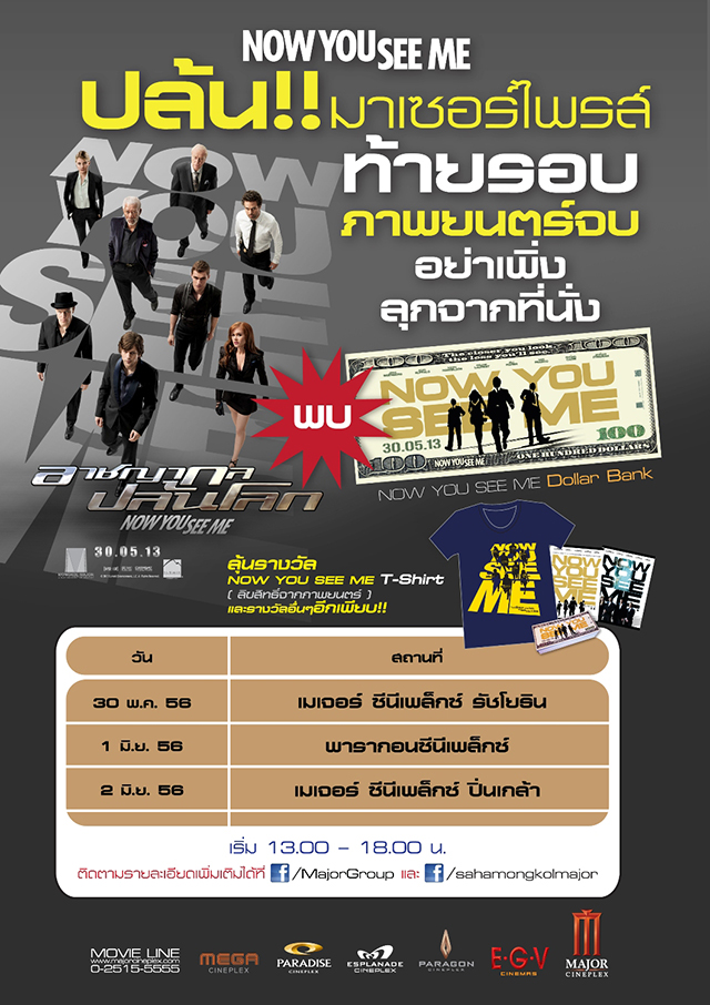 แฟนๆภาพยนตร์ NOW YOU SEE ME ชมเสร็จแล้วอย่าเพิ่งลุกไปไหน มาร่วมลุ้นหา Now You See Me Dollar Bank ไปกับเราเพื่อลุ้นรับรางวัลลิขสิทธิ์ต่างๆ จากภาพยนตร์มากมาย พบกันได้ตามสาขาต่อไปนี้...