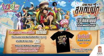 เพียงซื้อบัตรชมภาพยนตร์เรื่อง One Piece Stampede ที่นั่ง  Double sofa bed โรงคิดส์ ซีนีมา ทุก 1 คู่ ผ่านบัตร M Gen Kids พร้อมถ่ายภาพบัตรชมภาพยนตร์คู่กับ Standee (One Piece Stampede) และติด One Piece: Stampede Kids Cinema  หน้าโรงภาพยนตร์คิดส์ ซีนีมา รับทันที! เสื้อยืดเด็กลิขสิทธิ์แท้ มูลค่า 390.-  จำกัดจำนวน 100 ท่านแรกเท่านั้น