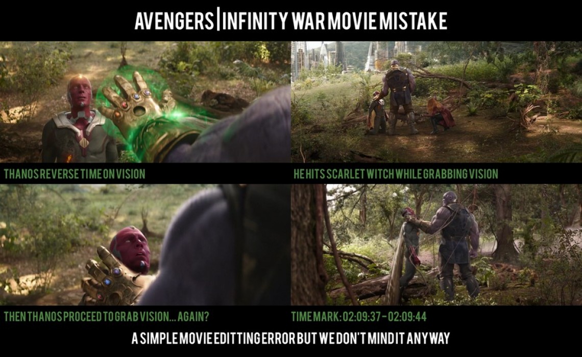 นำเสนอโดย wegotthiscovered จาก Heroic Hollywood ที่โพสต์ภาพที่แฟนหนังช่างสังเกตเห็นจุดผิดพลาดในการตัดต่อของภาพยนตร์ Avengers: Infinity War ในฉากปลิดชีพวิชั่นโดยธานอส โดยในรูปที่แฟนหนังยกมานี้ เป็นฉากที่ธานอสใช้ Time Stone ย้อนเวลาให้ Vision กลับมามีชีวิตอีกครั้ง ก่อนจะตบสการ์เล็ตวิชท์ให้ห่างออกไป โดยที่มือยังจับคอของวิชั่นอยู่ แต่เมื่อตัดมาอีกฉากกลับกลายเป็นว่าธานอสคลายมือที่คอวิชั่นแล้วจับใหม่ซะอย่างนั้น