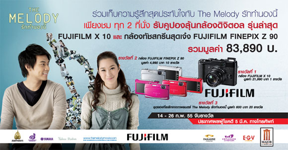 “ร่วมเก็บความรู้สึกประทับใจกับ The Melody รักทำนองนี้ “ รางวัลที่ 1 กล้อง FUJIFILM X10 มูลค่า 21,990 บาท 1 รางวัล คุณ ศิริวรรณ อินถาโท สาขา รามคำแหง รางวัลที่ 2 กล้อง FUJIFILM FINEPIX Z90 มูลค่า 4,990 บาท 10 รางวัล 1. คุณ วาเรศ พิทักษ์นคราช สาขา รังสิต 2. คุณ ชลธิชา พิชิตพันธ์พงศ์ สาขา นนทบุรี 3. คุณ มณฑิชา น้อยสัมฤทธิ์ สาขา รัชดา 4. คุณ ปิลันธนา พรหมชัย สาขา บางนา 5. คุณ สราณี เลิศศรีปรียา สาขา พาราไดซ์ พาร์ค 6. คุณ เมทวี กุญแจทอง สาขา พระราม 2 7. คุณ วาสนา ดุษฎีทวีวงศ์ สาขา สามเสน 8. คุณ นิยดา ทองเจน สาขา ศรีนครินทร์ 9. คุณ วราภรณ์ อ่อนแป้น สาขา รามคำแหง 10. คุณ โยคี บุญทัน สาขา แคราย รางวัลที่ 3 ของที่ระลึกจากภาพยนตร์ The Melody มูลค่า 600 บาท 20 รางวัล 1. คุณ ชเนตติ์ จิรายุวัฒนา สาขา บางนา 2. คุณ สิริมา จุกกระโทก สาขา สามเสน 3. คุณ สมใจ อมรรัตน์ธำรงค์ สาขา พาราไดซ์ พาร์ค 4. คุณ ศตพร ผันทรัพย์ สาขา นนทบุรี 5. คุณ เบญญดา บุญเพ็ง สาขา เพชรเกษม 6. คุณ วีรวรรณ วงศ์ศุภาลิศ สาขา พระราม 3 7. คุณ หทัยพร พุกะทรัพย์ สาขา ปิ่นเกล้า 8. คุณ บัณฑิตา อุไรศรี สาขา ศรีนครินทร์ 9. คุณ สิรินทรา เจริญพจน์ สาขา พาราไดซ์ พาร์ค 10. คุณ สิทะณัฎฐ ศรีพุทธา สาขา ปิ่นเกล้า 11. คุณ ณัฐยา ไทรหอมหวล สาขา รังสิต 12. คุณ อนิญญา สุรโคร สาขา นวนคร 13. คุณ กนกวรรณ ปานช่วย สาขา เพชรเกษม 14. คุณ กรรณิการ์ ชาติชวนชม สาขา บางนา 15. คุณ อนัญญา ศรียุทธ์ สาขา บางกะปิ 16. คุณ กรรณิกา เรืองฤทธิ์ สาขา นวนคร 17. คุณ ภัทร์ธีรา อินสองใจ สาขา รังสิต 18. คุณ สุริยพงศ์ ธนานุวัติคุณ สาขา เพชรเกษม 19. คุณ อนุชล พงโพธิ์ สาขา พระราม 2 20. คุณ ลักขณา บุญบุตร สาขา บางนาเงื่อนไขการรับสิทธิ์