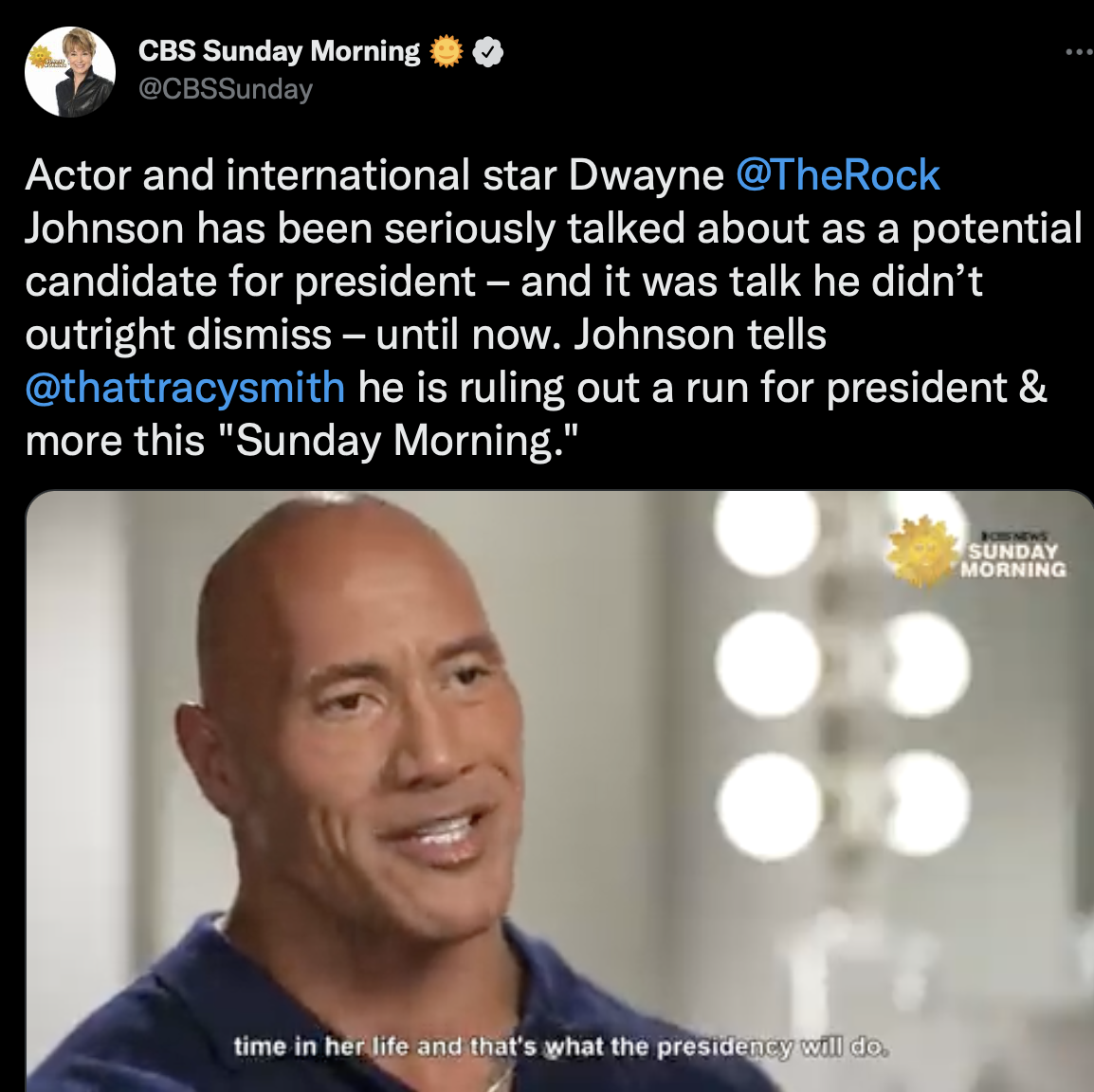 https://twitter.com/CBSSunday/status/1578374711565860865?ref_src=twsrc%5Etfw%7Ctwcamp%5Etweetembed%7Ctwterm%5E1578374711565860865%7Ctwgr%5Ec2068d4c593343123c211d3d09639a6d5def0009%7Ctwcon%5Es1_&ref_url=https%3A%2F%2Fwww.cbr.com%2Fdwayne-the-rock-johnson-not-running-us-president%2F