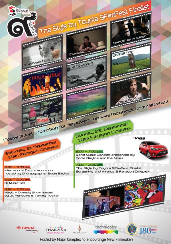 Paragon Cineplex is pleased to support emerging filmmakers and creative arts.  The weekend of 21 – 22 September will highlight Paragon Cineplex’s support of The Style by Toyota 9FilmFest.  Activities on Saturday, 21 September, open to the public at Infinicity Hall : 3:30 – 5:30    International Dance Workshop hosted by Eddie Baytos 6:30 – 7:30    Magic & Comedy Show hosted by Dr Penguin and Tummy Tucker   Activities on Sunday, 22 September, at Infinicity Hall : 5:00 – 6:30   World Music Concert hosted by Eddie Baytos 7:00 – 9:00    The Style by Toyota 9FilmFest Finalists Screening and Awards Ceremony