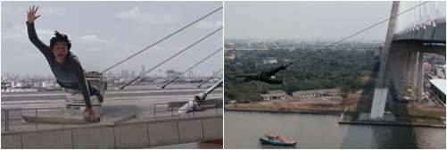 “ก่อนการโดดผมก็เตรียมใจไว้เหมือนกันครับ เตรียมความพร้อมเตรียมใจไหว้พระสวดมนต์ ครับ (หัวเราะ) ก็พี่ปรัชคิด อาจารย์พันนาคิดมา ผมตอบสนองครับ ฉากนี้เราเล่นกับเรื่องของแรงโนมถ่วง แรงดึงดูดของโลก ก็หวาดเสียวครับตอนที่เสียวที่สุดก็คือช่วงจังหวะที่นับ 5 4 3 2 แอ็คชั่น พอปล่อยเนี่ยมันมีความรู้สึกว่าเหวอนะแต่ได้อารมณ์มาแบบของจริง เสียวจริงครับ (หัวเราะ) แต่ผมมีความสบายใจอุ่นใจก็คือทีมงานทุกคนไม่ว่าจะเป็นผู้กำกับ ทีมสตันท์แมน ทีมเซฟตี้ทุกคนนะครับ ดูแลความปลอดภัยอย่างดี จนทำให้เราเกิดความรู้สึกว่าเราสบายใจ เราถึงเล่น แต่ถือว่าเป็นครั้งแรกในชีวิตเลยก็ว่าได้ที่ผมได้ไปโหนอยู่ข้างบน ถือว่าผมโชคดีแล้วนะครับเป็นเกียรติอย่างยิ่งที่ได้มาโหนสะพาน เพราะปกติแล้วไม่มีใครบ้ามาโหนแบบนี้นะครับ (หัวเราะ)”