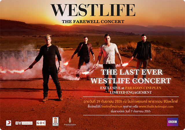 Westlife เป็นวงบอยแบนด์ เริ่มก่อตั้งกันขึ้นเมื่อปี 2541 หลังจากที่พวกเขาปล่อยซิงเกิ้ลแรก Swear It Again วงบอยแบนด์นี้ก็ดังทะลุชาร์ตทั้งในไอร์แลนด์เองและที่อังกฤษในเวลาต่อมา ในปี 2554 พวกเขาประกาศการแยกวงหลังจากแสดงคอนเสิร์ตไปแล้ว12 คอนเสิร์ตในปีนั้น และในวันที่ 23 มิถุนายน 2555 Westlife ก็ได้แสดงคอนเสิร์ตอำลาสุดท้าย โดยเป็นคอนเสิร์ต2ชั่วโมง แสดงสดที่เมืองดับบลิน ประเทศไอร์แลนด์ พวกเขาได้นำเพลงดังๆมาร้องมากมายเพื่อเป็นการอำลาเป็นครั้งสุดท้าย แฟน Westlife ในเมืองไทยจะได้รับสิทธิพิเศษในการร่วมดูคอนเสิร์ตอำลาของ Westlife ได้ที่ Paragon Cineplex ในวันที่ 29 กันยายน 2555 เวลา 18.00น. คอนเสิร์ตนี้ยาว 141 นาที โดยจะได้ฟังเพลงฮิตๆเช่น “Flying Without Wings”, “You Raise Me Up”, “World of Our Own” and “Uptown Girl”จากโรงภาพยนตร์คุณภาพสูงของ พารากอน ซีนิเพล็กซ์ ที่เดียวเท่านั้น แฟนๆพลาดไม่ได้เพราะคอนเสิร์ตนี้จะมีแค่วันเดียวและครั้งเดียว สามารถซื้อตั๋วชมคอนเสิร์ตได้ที่ เคาว์นเตอร์ Thaiticketmajor ทุกสาขาได้ตั้งแต่วันที่ 7 กันยายน 2555 สามารถซื้อตั๋วได้แล้ววันนี้ที่ ไทยทิคเก็ตเมเจอร์ ทุกสาขา หรือ www.thaiticketmajor.com ตั๋วราคา 300, 400 บาท