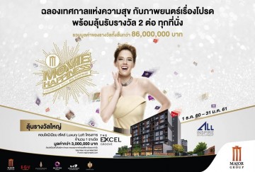 โดย คุณวิชัย กุลธวัชชัย ผู้อำนวยการฝ่ายการตลาด บริษัท เมเจอร์ ซีนีเพล็กซ์ กรุ้ป จำกัด (มหาชน) ร่วมกับ คุณธนากร ธนวริทธิ์ ประธานเจ้าหน้าที่บริหาร บริษัท ออลล์ อินสไปร์ ดีเวลลอปเม้นท์ จำกัด (มหาชน) ร่วมมอบรางวัล คอนโดมิเนียม สไตล์ลัคซูรี่ ลอฟท์ โครงการ The EXCEL GROOVE จาก ออลล์ อินสไปร์ มูลค่ากว่า 3 ล้านบาท ให้แก่ คุณ ณรินทิพย์ ตันติอลงการ ลูกค้าผู้โชคดีจากแคมเปญส่งท้ายปี “Movie Happiness : Celebrate With Big Surprise” ฉลองเทศกาลความสุขกับการชมภาพยนตร์เรื่องโปรดลุ้นรับโชคกับรางวัลใหญ่