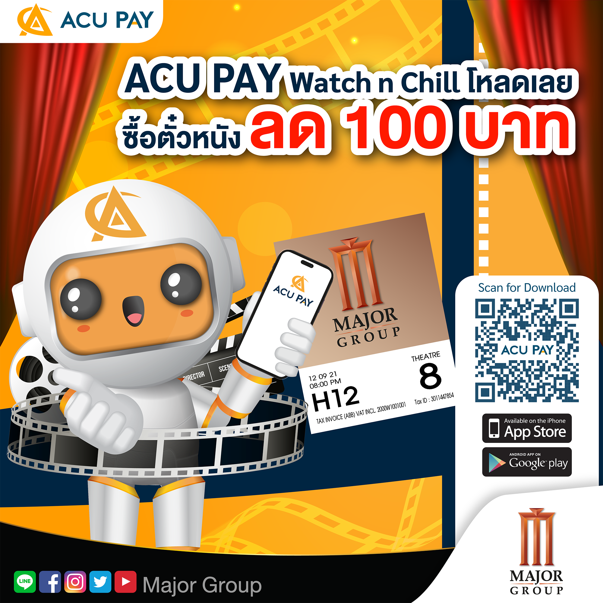 • ลูกค้า ACU PAY แลกรับส่วนลดบัตรชมภาพยนตร์ มูลค่า 100 บาท เพียงกดรับสิทธิ์ผ่าน ACU PAY E-Wallet พร้อมนำ Code ไปใช้สิทธิ์ ชำระผ่าน ACU PAY E-Wallet เท่านั้น