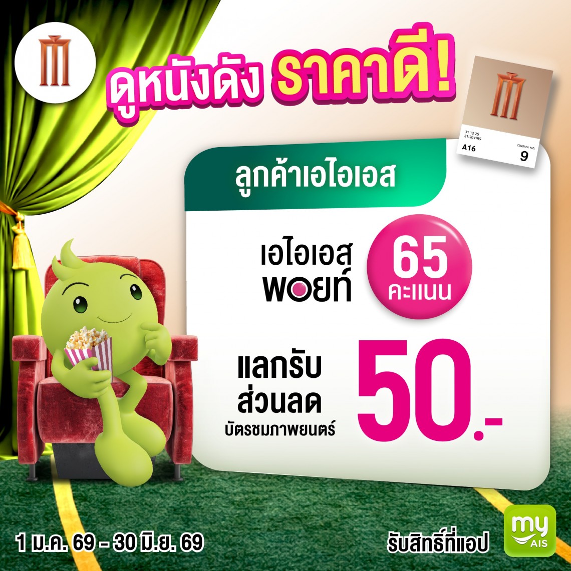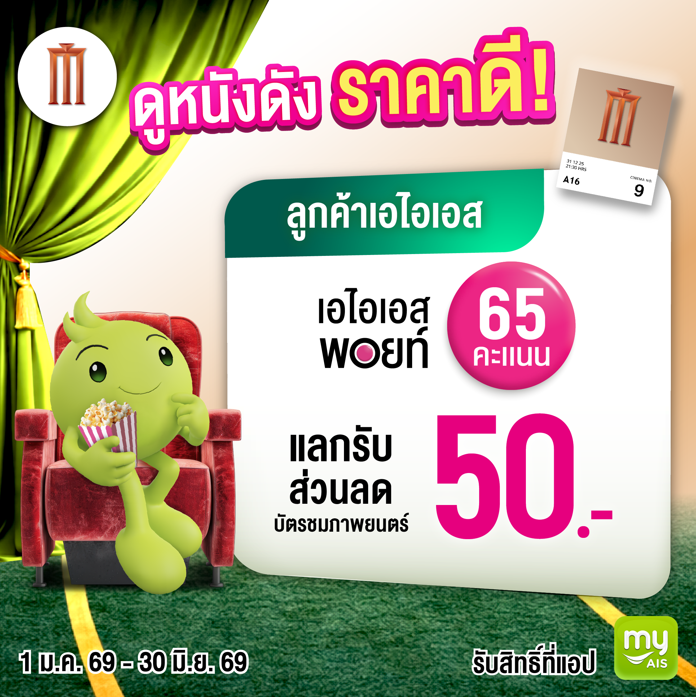 •  ลูกค้า AIS แลกรับส่วนลดสำหรับบัตรชมภาพยนตร์ ใช้ 65 พอยท์ แลกรับส่วนลด 50 บาท เมื่อซื้อบัตรชมภาพยนตร์ 1 ที่นั่ง แลกคะแนนผ่าน myAIS Application