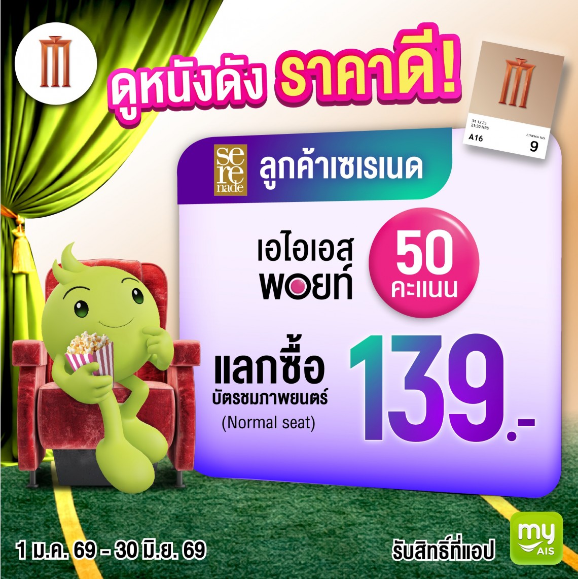•  ลูกค้า AIS Serenade ใช้ 50 คะแนน แลกซื้อบัตรชมภาพยนตร์ในราคา 139 บาทแลกเมื่อซื้อบัตรชมภาพยนตร์ 1 ที่นั่ง แลกคะแนนผ่าน myAIS Application