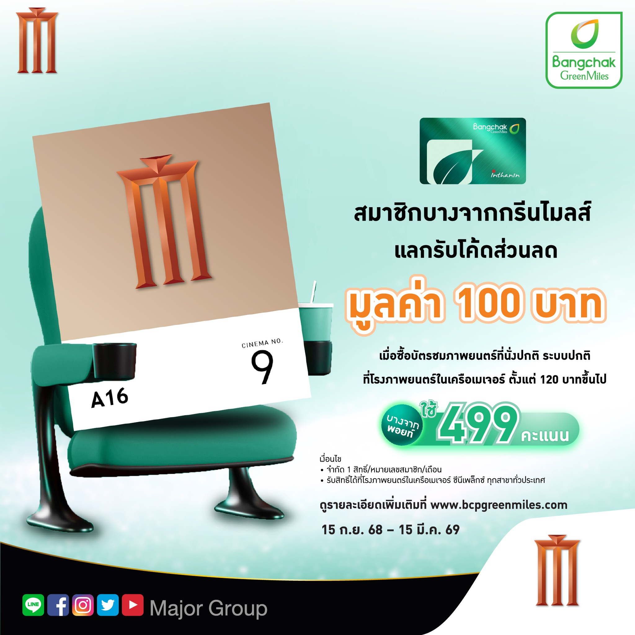 • สมาชิกบางจาก กรีนไมลส์ ใช้ 499 คะแนน แลกรับโค้ดส่วนลด มูลค่า 100 บาท เมื่อซื้อบัตรชมภาพยนตร์ที่นั่งปกติ ระบบปกติ ที่โรงภาพยนตร์ในเครือเมเจอร์ ซีนีเพล็กซ์ เมื่อซื้อบัตรชมภาพยนตร์ในราคาปกติตั้งแต่ 120 บาทขึ้นไป