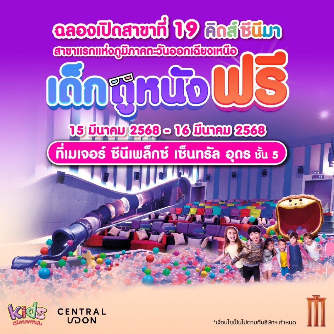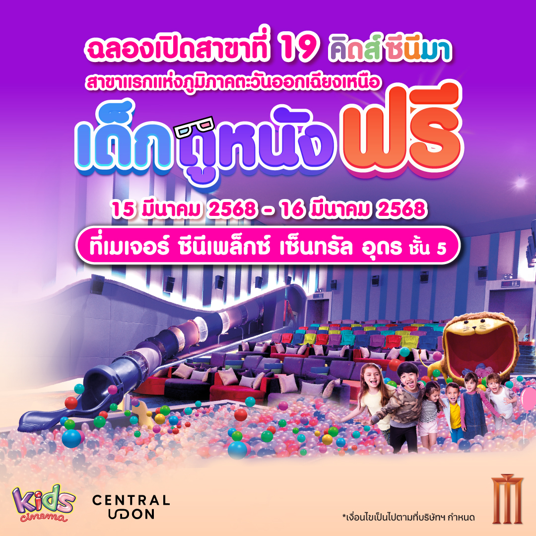 ฉลองเปิดสาขาที่ 19 คิดส์ ซีนีมา เมเจอร์ ซีนีเพล็กซ์ เซ็นทรัล อุดร สาขาแรกแห่งภูมิภาคตะวันออกเฉียงเหนือ เด็กดูหนังฟรีตลอดวัน! 15 มีนาคม 2568 – 16 มีนาคม 2568 ชาวอุดรธานีและจังหวัดใกล้เคียงเตรียมพบความสนุกกับโรงภาพยนตร์สำหรับเด็กและครอบครัว ที่จัดเต็มด้วยภาพยนตร์แสนสนุก สไลเดอร์และบ่อบอลยักษ์ พร้อมโปรโมชันมากมาย โดยมีรายละเอียดดังนี้