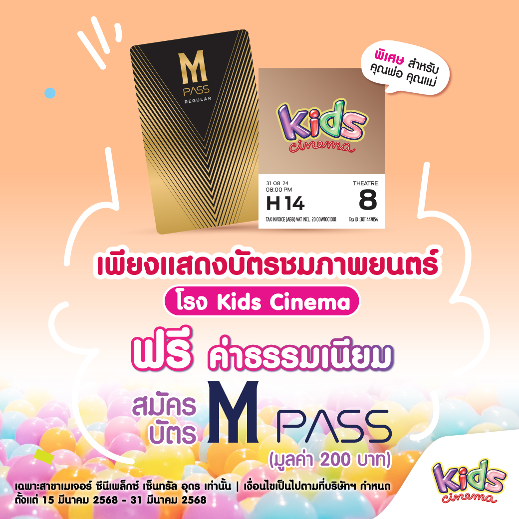 สำหรับผู้ปกครองสมัครบัตร M Pass ฟรีค่าธรรมเนียม มูลค่า 200 บาท เพียงแสดงบัตรชมภาพยนตร์คิดส์ ซีนีใส