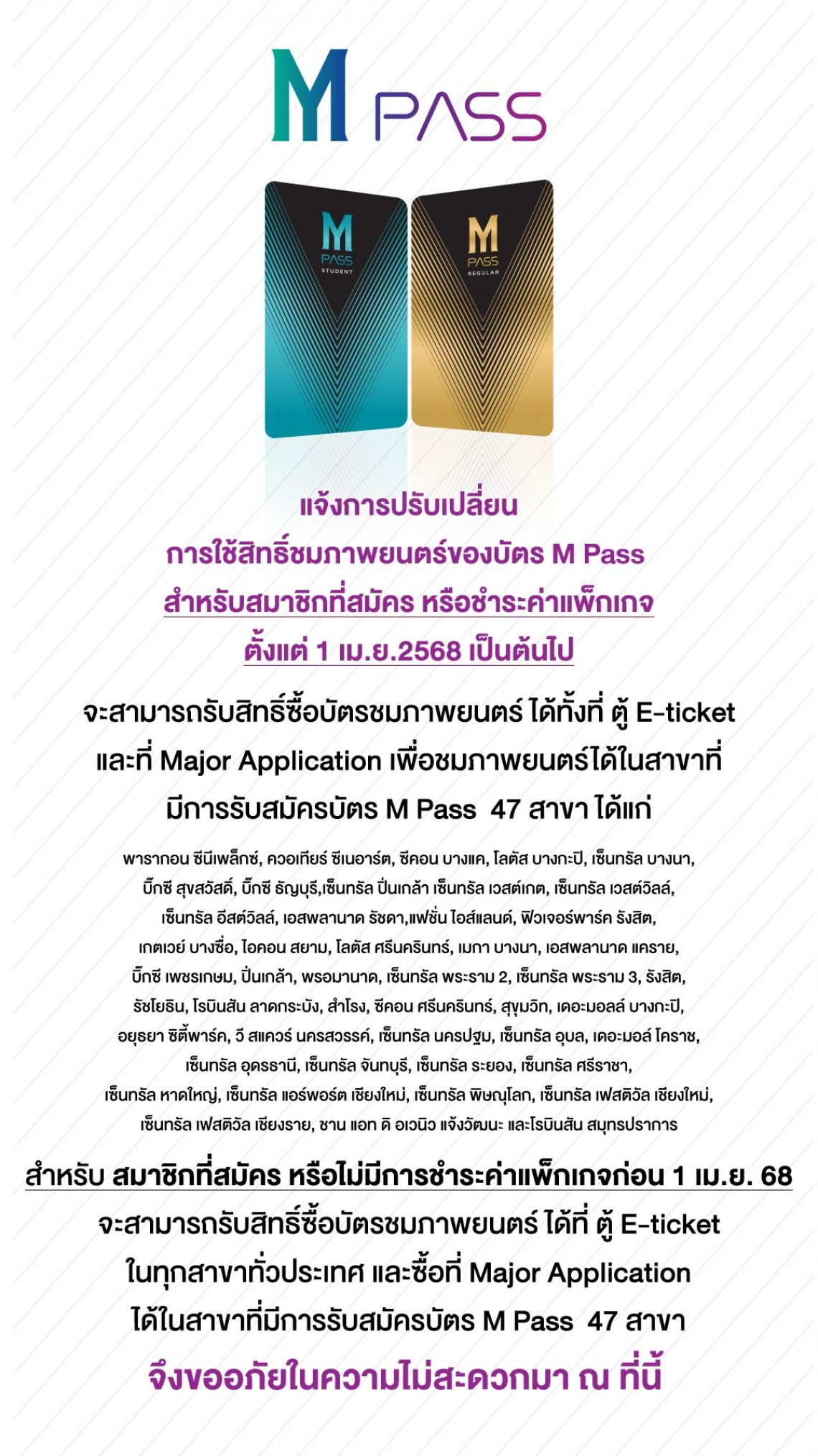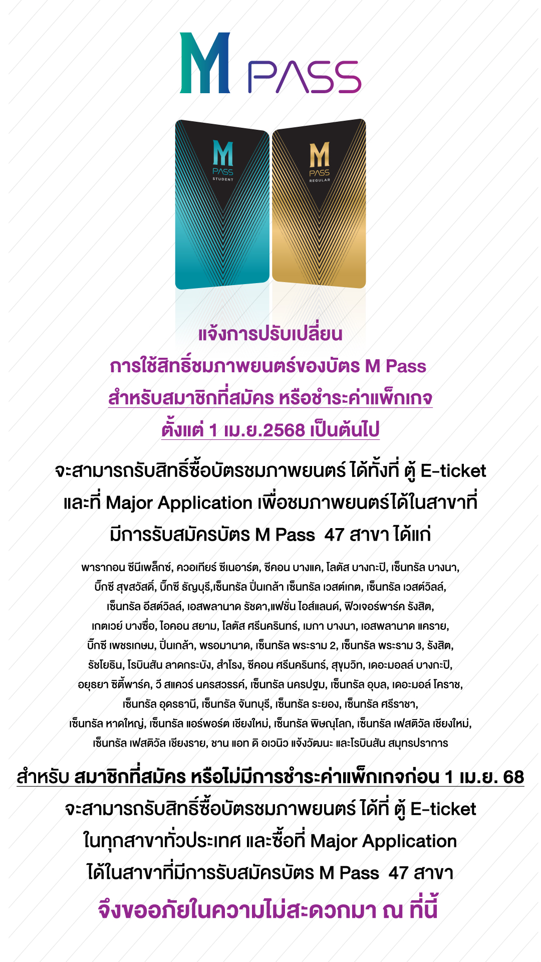 แจ้งเปลี่ยนแปลงสิทธิ์การชมภาพยนตร์ของบัตร M PASS  ตั้งแต่ 1 เมษายน เป็นต้นไป