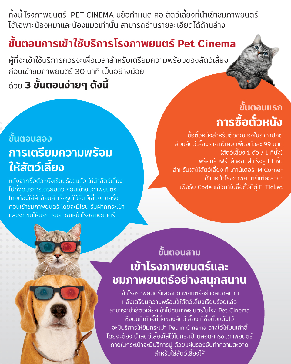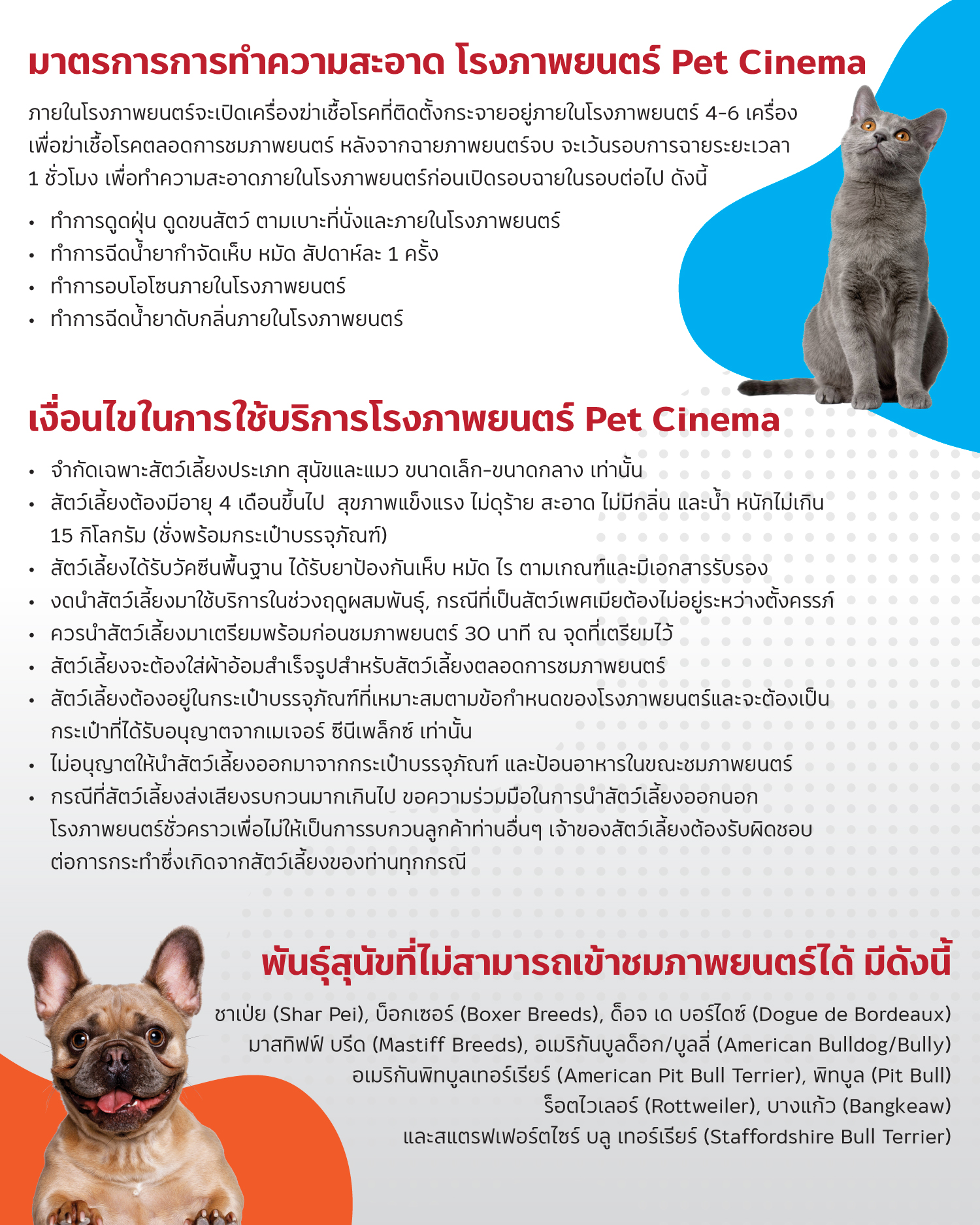 PET CINEMA โรงภาพยนตร์สำหรับคนรักสุนัขและแมวแห่งแรกในประเทศไทย ถือเป็น โรงภาพยนตร์ PET Friendly แห่งแรก ที่พร้อมต้อนรับเจ้าของและน้องหมา น้องแมว เข้ามาร่วมดูหนังด้วยกันในวันหยุดเสาร์และอาทิตย์ รอบเวลาฉายรอบแรกของวัน