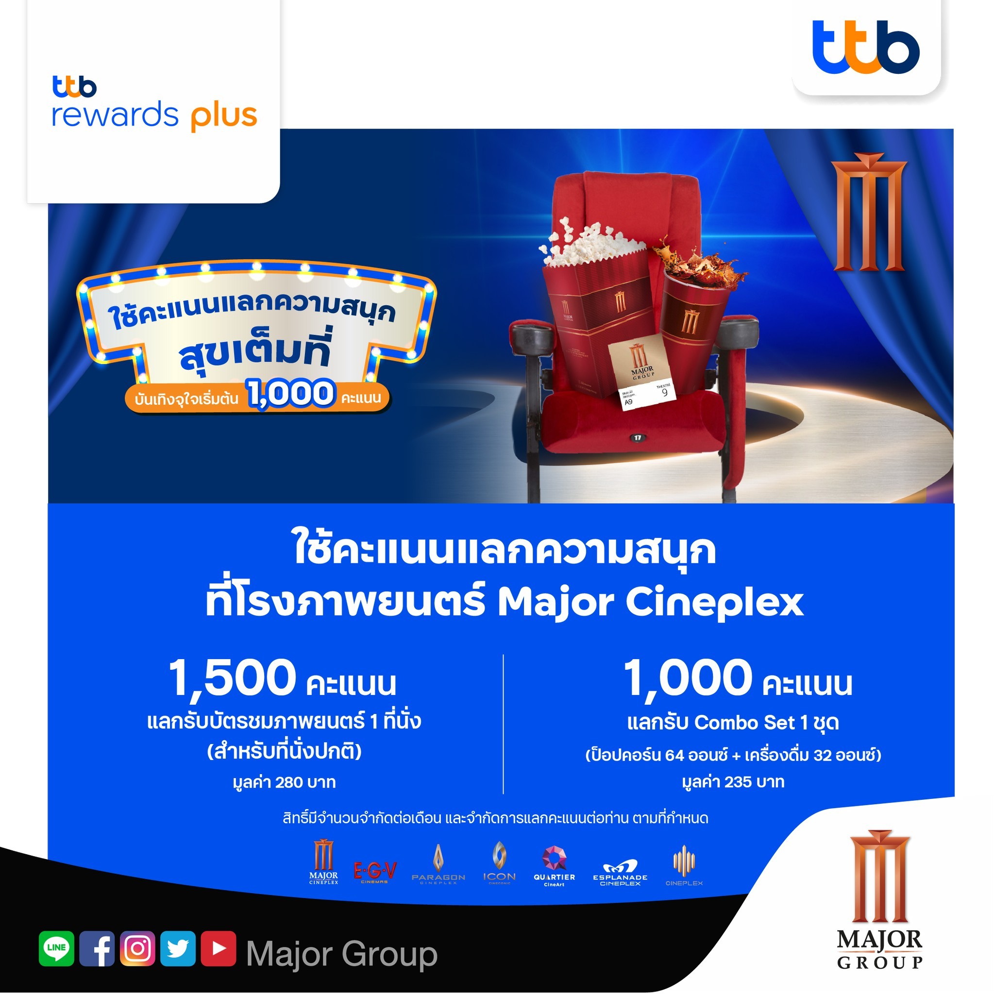 สิทธิพิเศษเฉพาะลูกค้าบัตรเครดิต ttb (บัตรเครดิตทีเอ็มบี บัตรเครดิตธนชาต) ที่ร่วมรายการ ใช้ 1,000 คะแนน แลกรับ Combo Set 1 ชุด ( Popcorn 64 Oz + Drink 32 Oz )